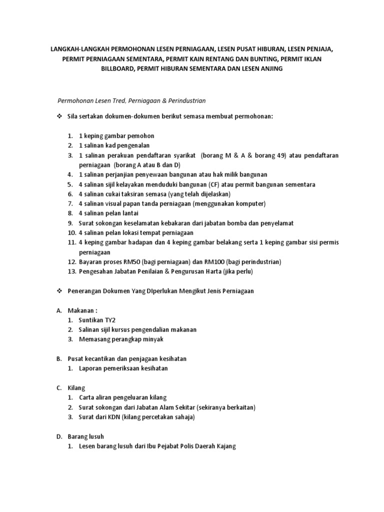 Lesen berniaga dibawah ordinan lesen perniagaan, 1948. Contoh surat permohonan bantuan dana kegiatan. Perjanjian sewa premis di antara pemilik dengan pemohon atau perjanjian sewa beli sekiranya pemohon adalah pemilik premis perniagaan atau surat kebenaran daripada pemilik. Penyediaan dokumen permohonan dan dokumen lain yang diperlukan. Senarai semak untuk permohonan lesen premis perniagaan dan iklan.