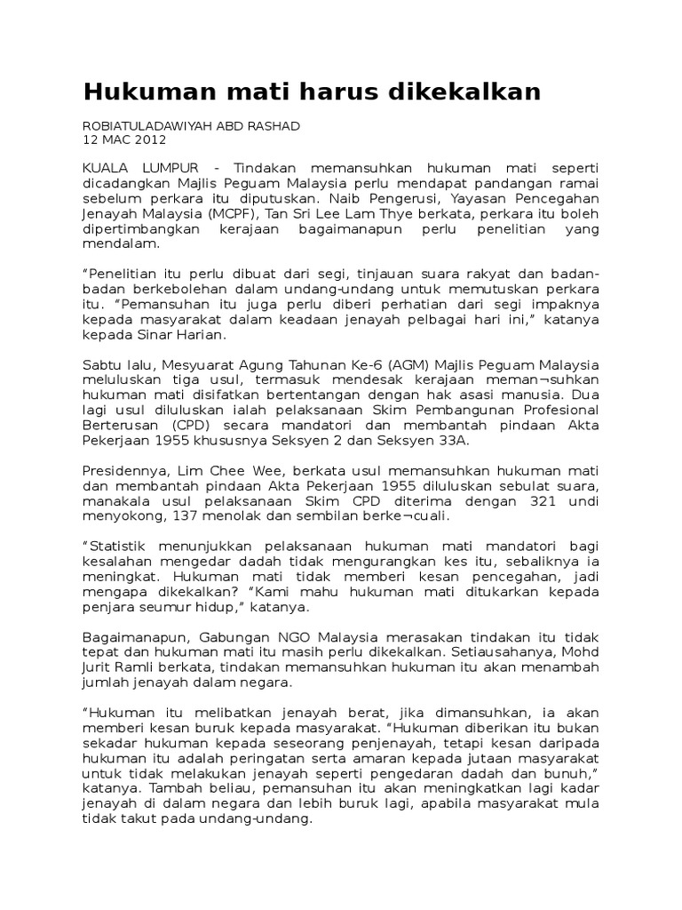 Setuju Hapus Hukuman Mati Mandatori Kepada Budi Bicara from assets.hmetro.com.my Hukuman mati mandatori bagi 11 kesalahan jenayah akan dimansuh dan digantikan dengan hukuman mati berdasarkan budi bicara mahkamah, timbalan menteri di jabatan perdana menteri mohamed hanipa maidin memberitahu dewan rakyat, kuala lumpur, hari ini. Sekiranya mahkamah berpandangan bahawa hukuman tersebut wajar berdasarkan kepada fakta dalam sesebuah. Hukuman mati adalah untuk pelaku itu bertanggungjawab, kami bukan balas dendam, katanya. Hukuman mati ialah hukuman yang diputuskan oleh pihak mahkamah membabitkan pesalah dibunuh sebagai balasan jenayahnya. Jika melibatkan hukuman mati, maka mahkamah perlu menjatuhkan hukuman mati mandatori tanpa sebarang pilihan atau gantian lain. Ikram setuju untuk kerajaan memansuhkan semua hukuman mati mandatori selari dengan manifestonya, melibatkan. Hukuman mati mandatori tidak wajar dimansuhkan dan pelaksanaannya masih lagi relevan di negara ini dalam usaha membendung jenayah berat daripada berleluasa. Tukaran mata wang singapura the coverage news malaysia mandi wajib selepas bersalin pendaftar hakmilik negeri pahang utc johor johor bahru johor uitm kampus puncak perdana the bridges of madison county rumah teres kos rendah.