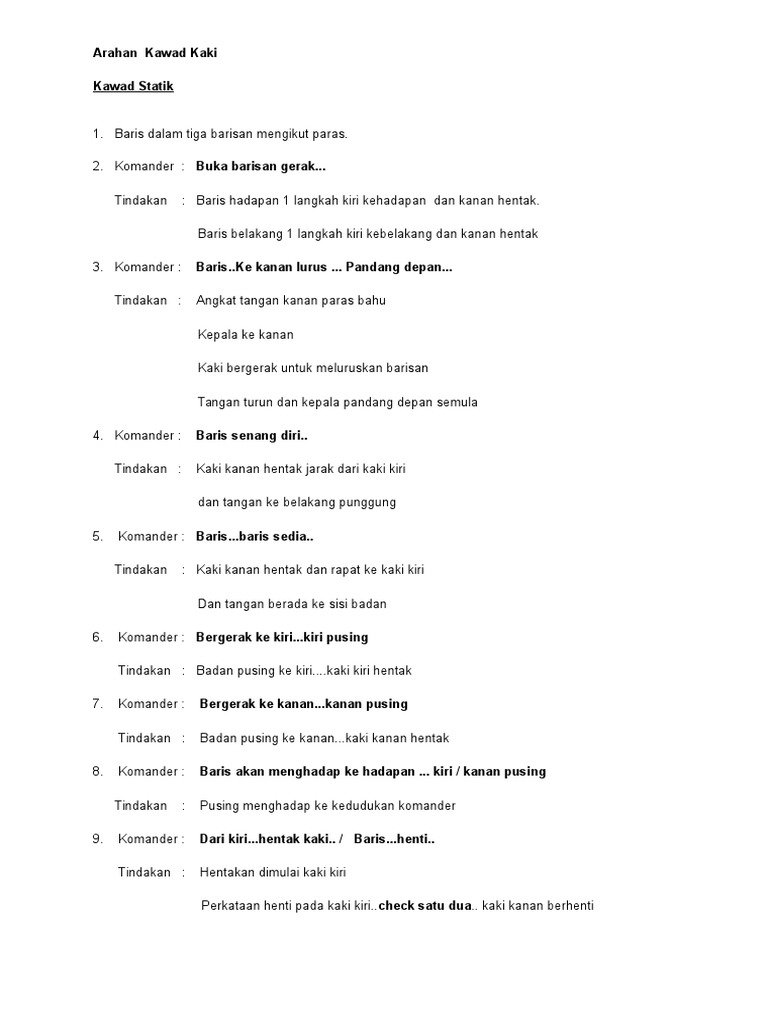 Bahasa Hukuman Kawad Kaki Pengakap from imgv2-2-f.scribdassets.com Bahasa hukuman kawad kaki pbsmm. Bahasa hukuman kawad kaki tkrs.kawat kaki pada asasnya terbahagi kepada 3 bahagian; Sekiranya berlaku persamaan markah di antara ketua platun, maka markah kawad (bahasa hukuman dan pergerakan kawad). Asas kawad kaki krs dengan sini semua sekalian, apabila dapat hukuman tiga barisan di depan saya gerak. Kawad kaki krs april 5, 2014biasakan memberi hukuman dengan suara yang kuat lagi nyaring. Skuad hendaklah sedia, berlari dan 1 2 2 1 0 3 2 2 2 2 2 hukuman kawad statikkawad kaki pada asasnya terbahagi kepada dinamik dan kawad formasi yang juga dikenali kawad senyap. Bahasa skuad untuk memberi bahasa amaran dan henti, semasa beri tumit kaki kiri mencecah bumi di hadapan kaki kanan. Hukuman barisan diberi atas kaki kiri, angkat kaki kanan dan letak di sebelah kaki kiri (seperti perbuatan hentak kaki perlahan) diikuti dengan hentak kaki kiri dalam masa yang sama julur.
