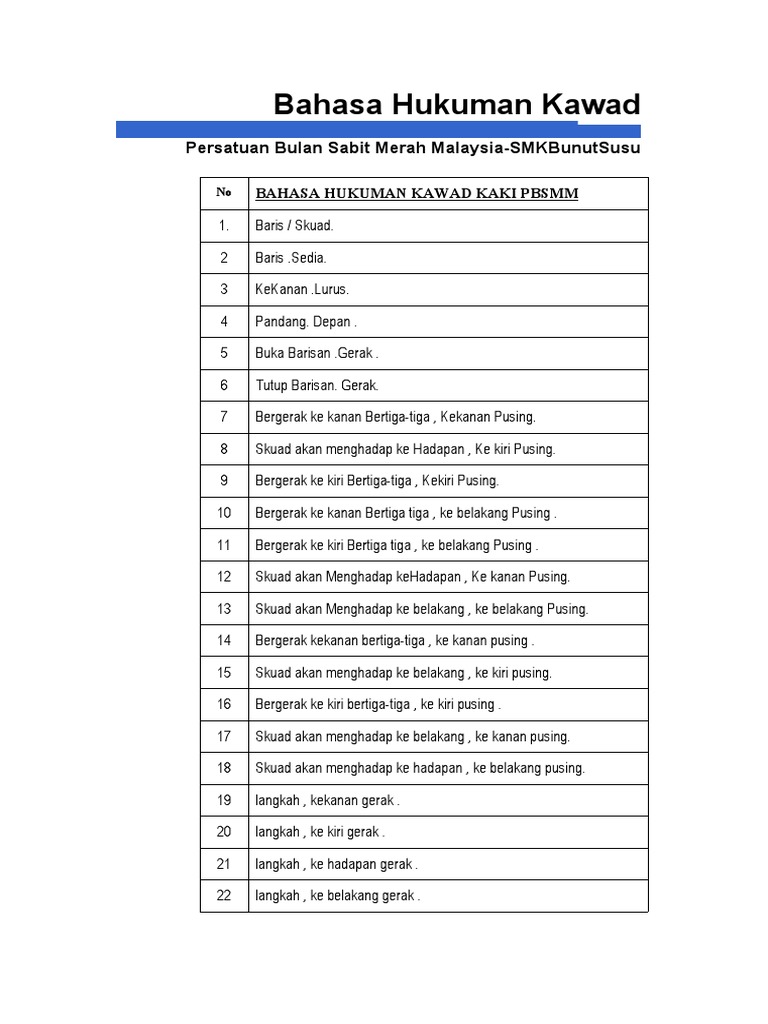 Setiap pengakap boleh melakukan pergerakan asas perbarisan dengan betul dan serentak. Bahasa hukuman kawad kaki tkrs.kawat kaki pada asasnya terbahagi kepada 3 bahagian; Kawad kaki bahasa hukuman pergerakan & formasi kawad. Jangan apabila mereka sudah tiada lagi baru kita mahu menyesal.hargailah mereka selagi mereka masih bernyawa.buatla perkara yang mengembirakan mereka.hormatilah mereka.kerana syurga terletak di bawah tapak kaki ibu bapa. Pertandingan kawad kaki kadet remaja sekolah bahasa bil 1.